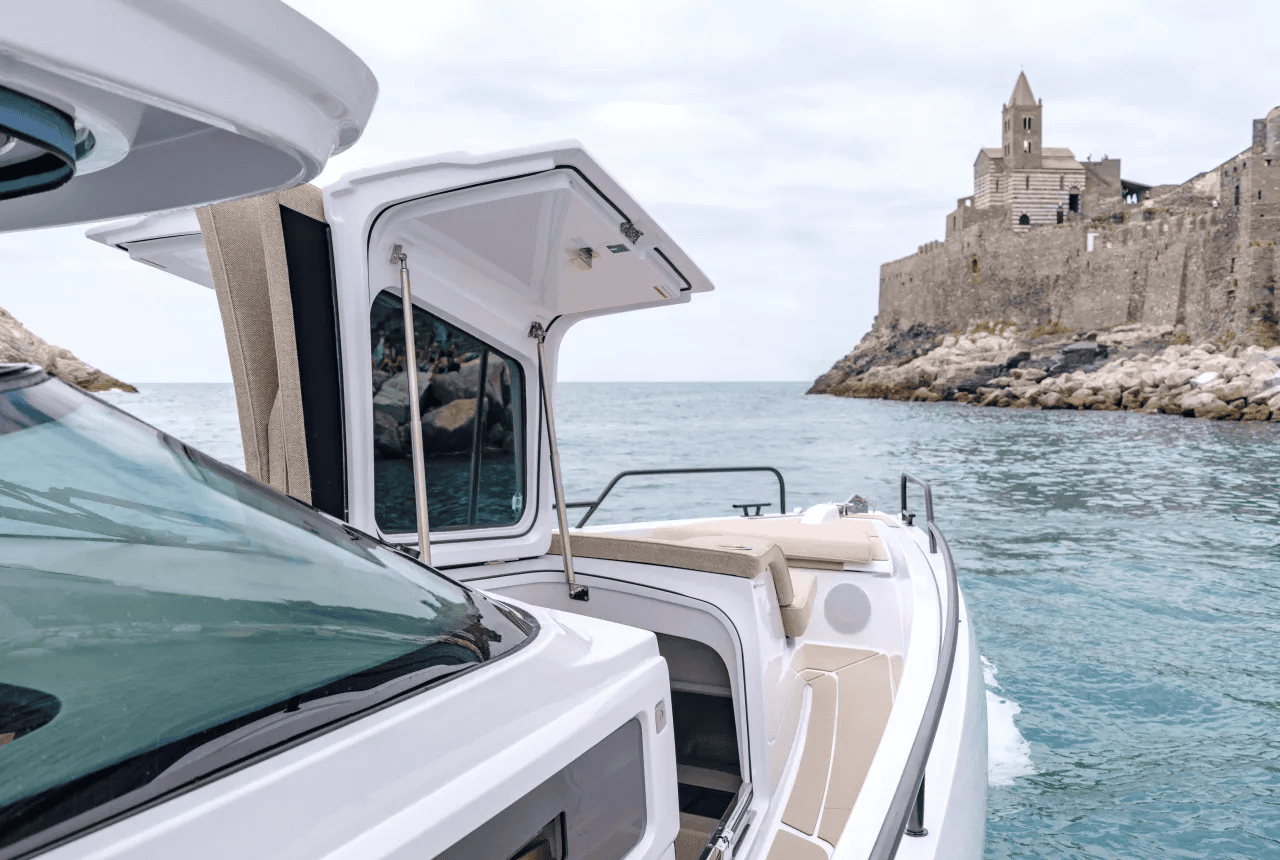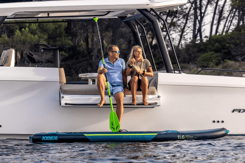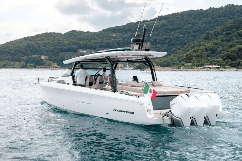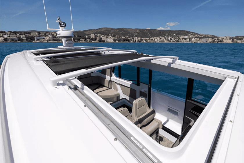 - Axopar 3D signature chrome logo and openable balcony doors on both sides of hull
