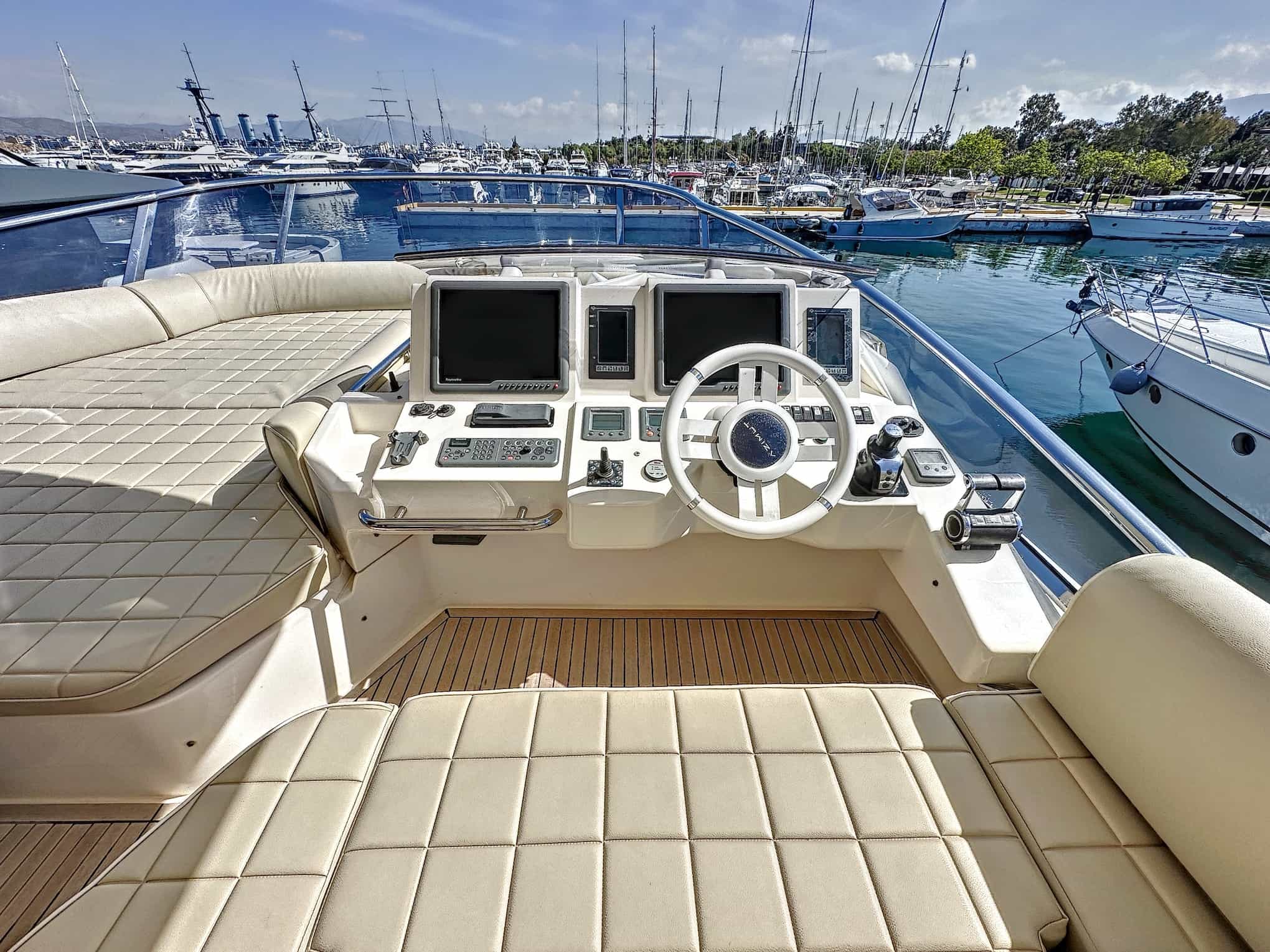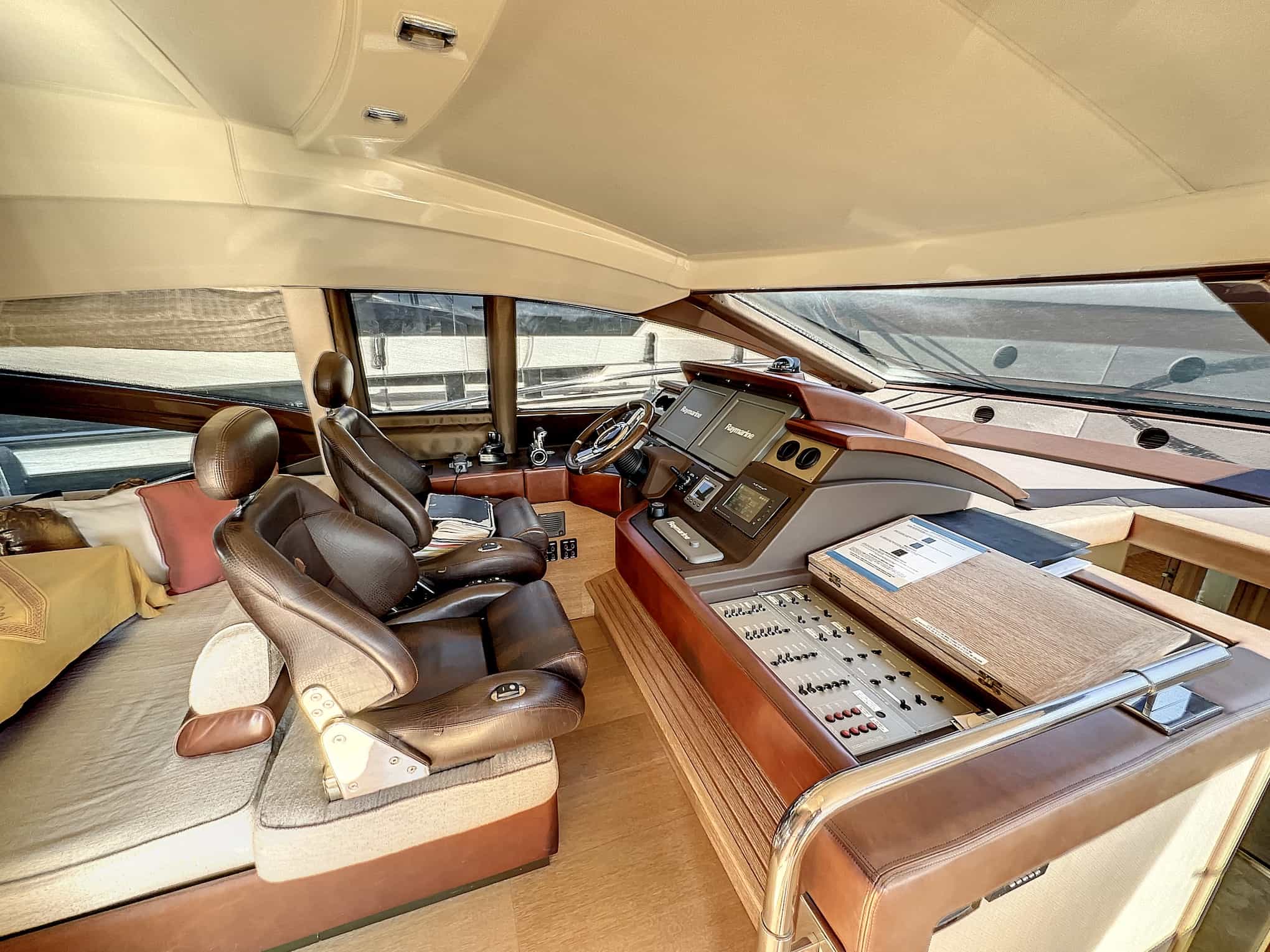 Flybridge helm station: Quick Anchor windlass control with Chain Counter, 12V Receptacle, Trim tab controls, New 2016 Xentra Joy Stick Controls, MAN Engine Instrumentation, Single Trumpet Air horn, navigation light controls, Raymarine G Series Radar/Plotter, Raymarine ST6002 Autopilot, Raymarine RAY240 VHF, Raymarine ST60 Depth/Speed, rudder angle indicator, steering wheel control, Jabsco electric searchlight control