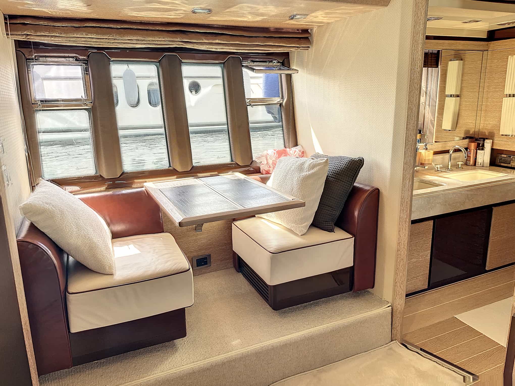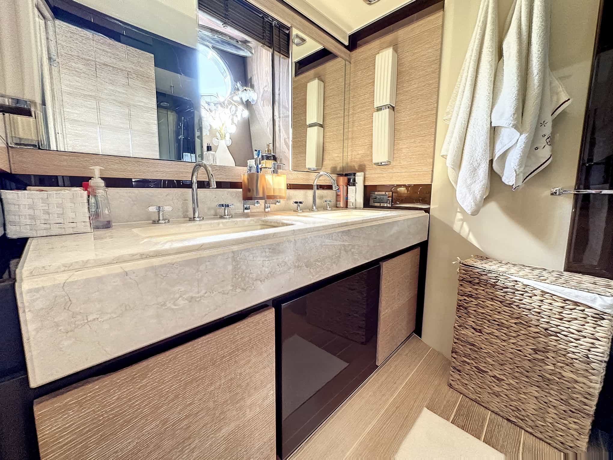 Owner cabin: Wall Mounted 40′ Sharpe 1080 Flat Screen TV with Direct TV Receiver and Apple TV, BOSE 123 Surround Sound