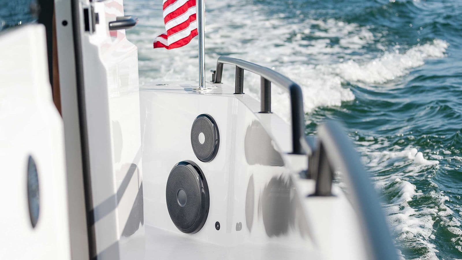 - Фирменный хромированный 3D-логотип Axopar с обеих сторон корпуса