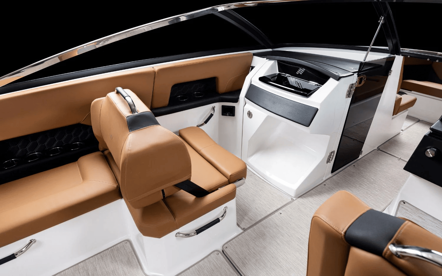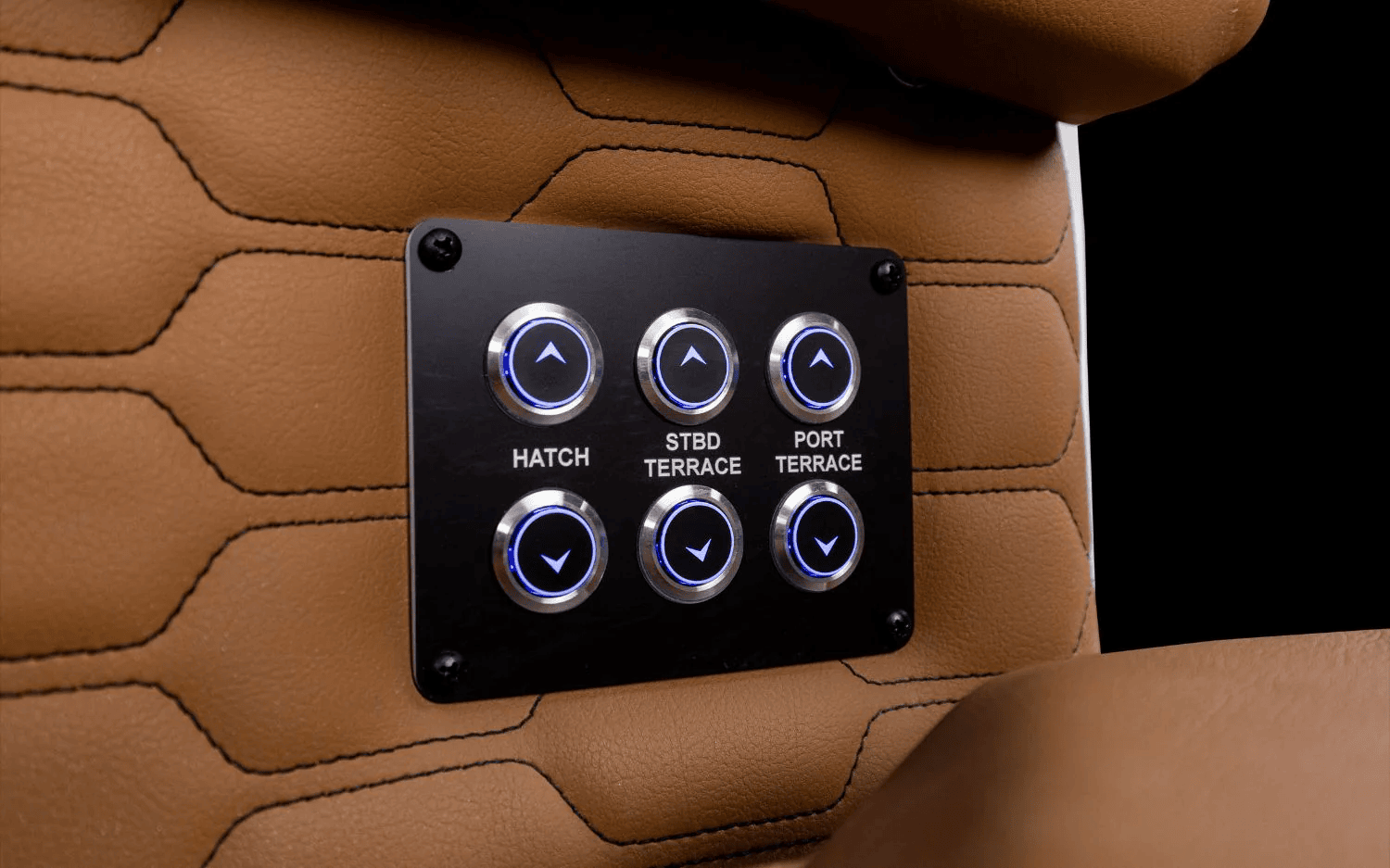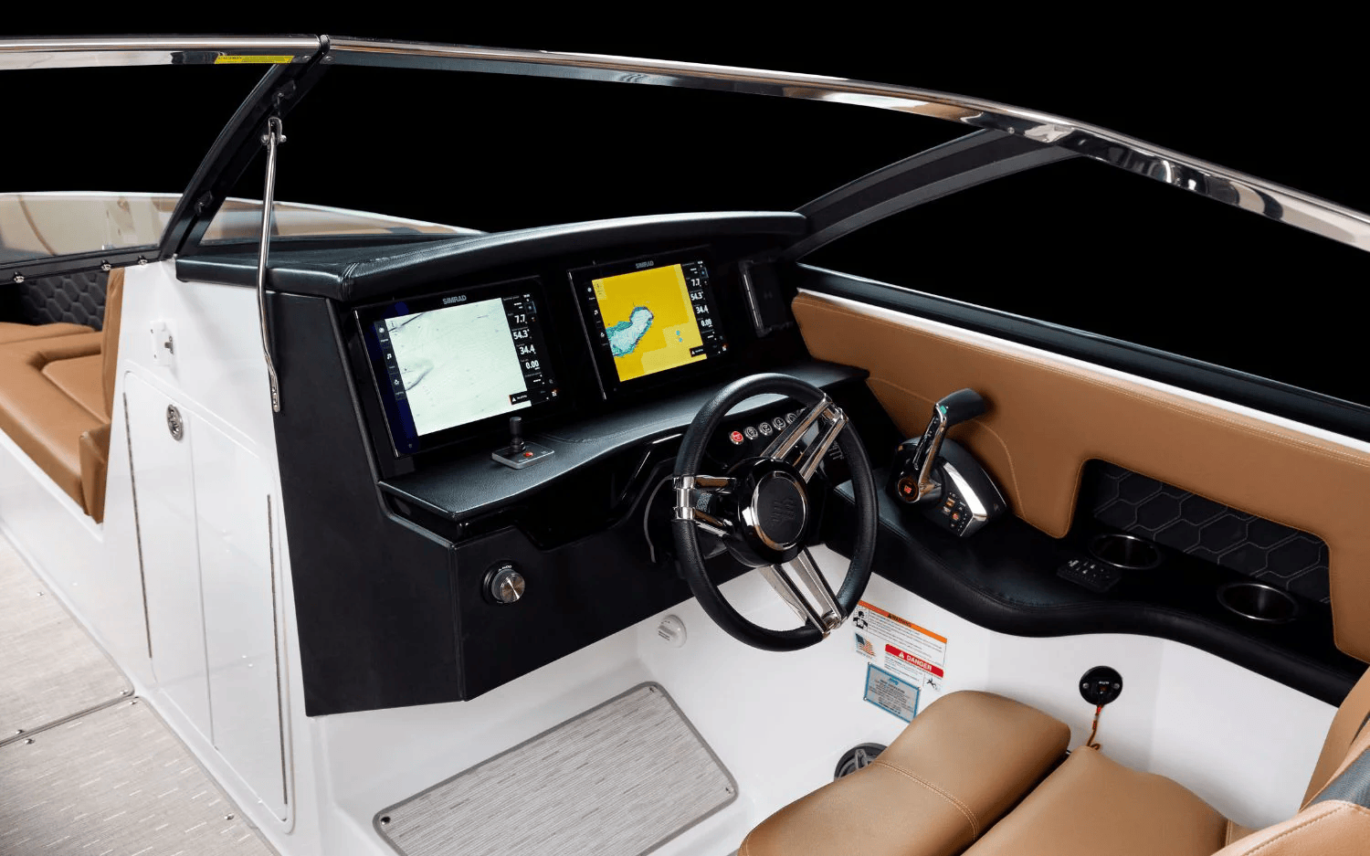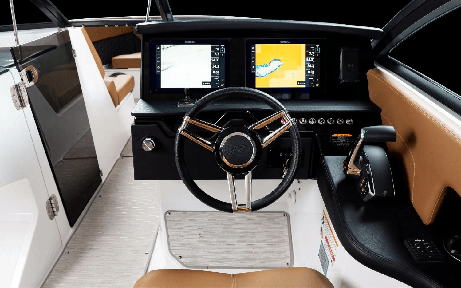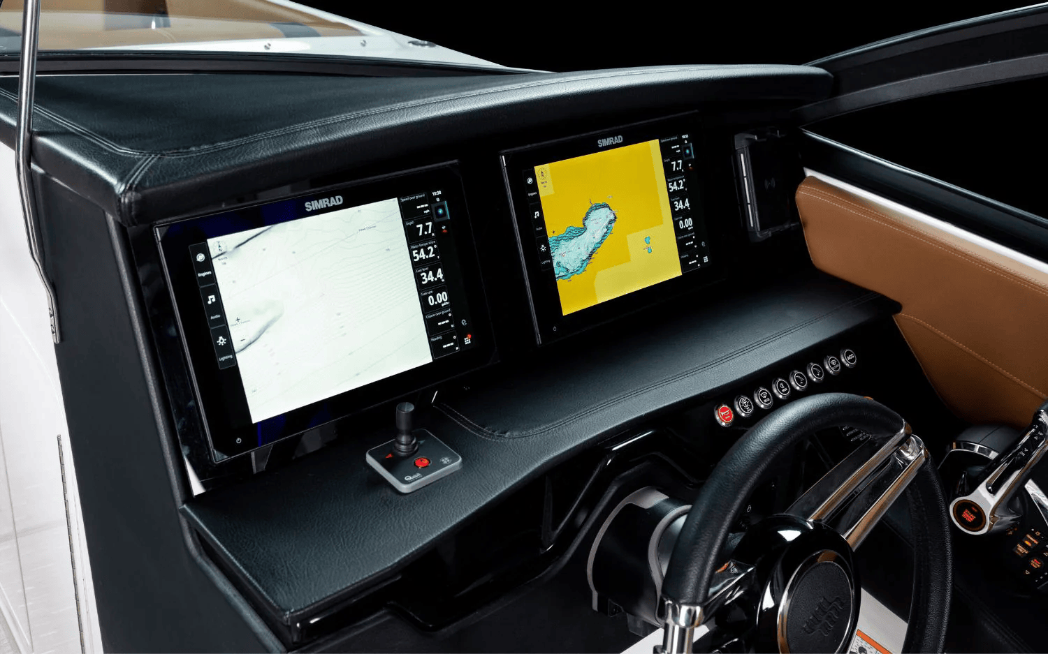 - Приборы штурмана: два 12-дюймовых MFD с сенсорным экраном с данными о двигателе: активное управление и мониторинг, предзагруженные карты, управление аудио, трансдуктор (вода, температура, сонар)