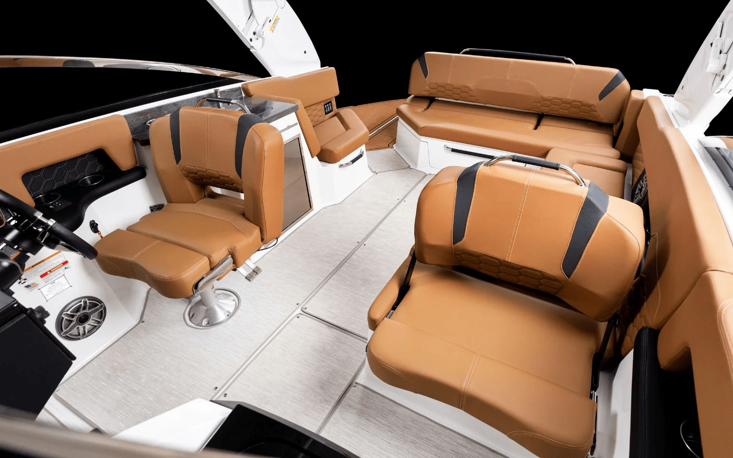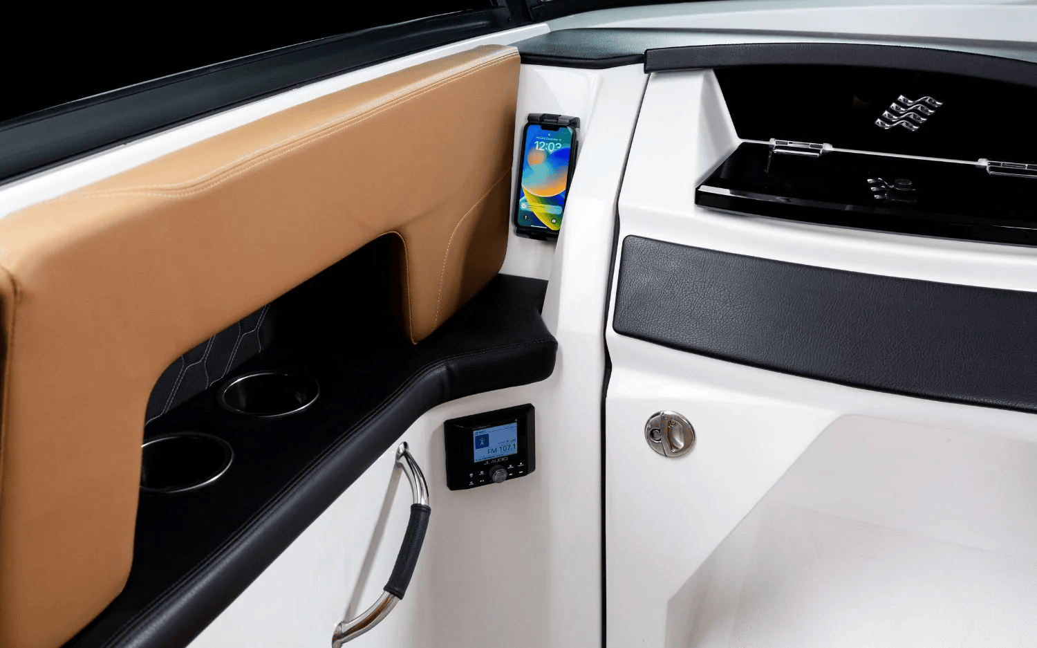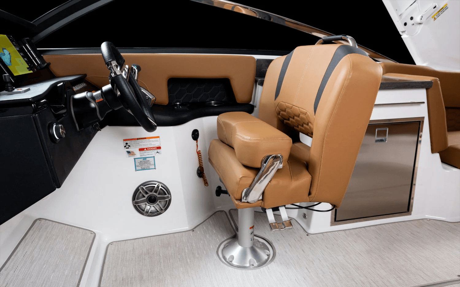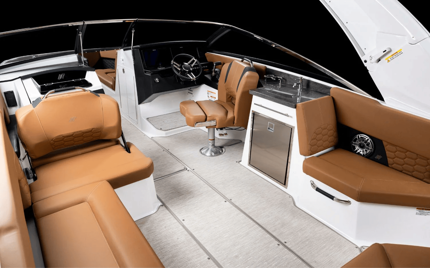 - Приборы штурмана: два 12-дюймовых MFD с сенсорным экраном с данными о двигателе: активное управление и мониторинг, предзагруженные карты, управление аудио, трансдуктор (вода, температура, сонар)