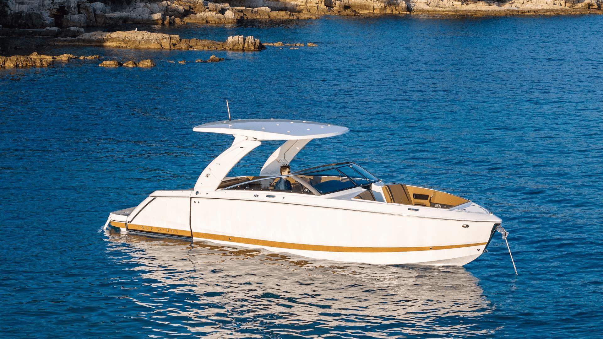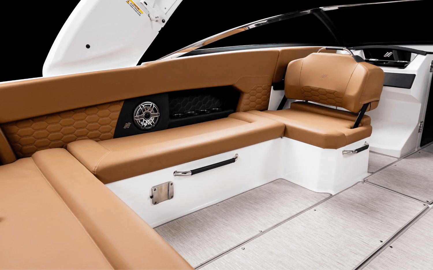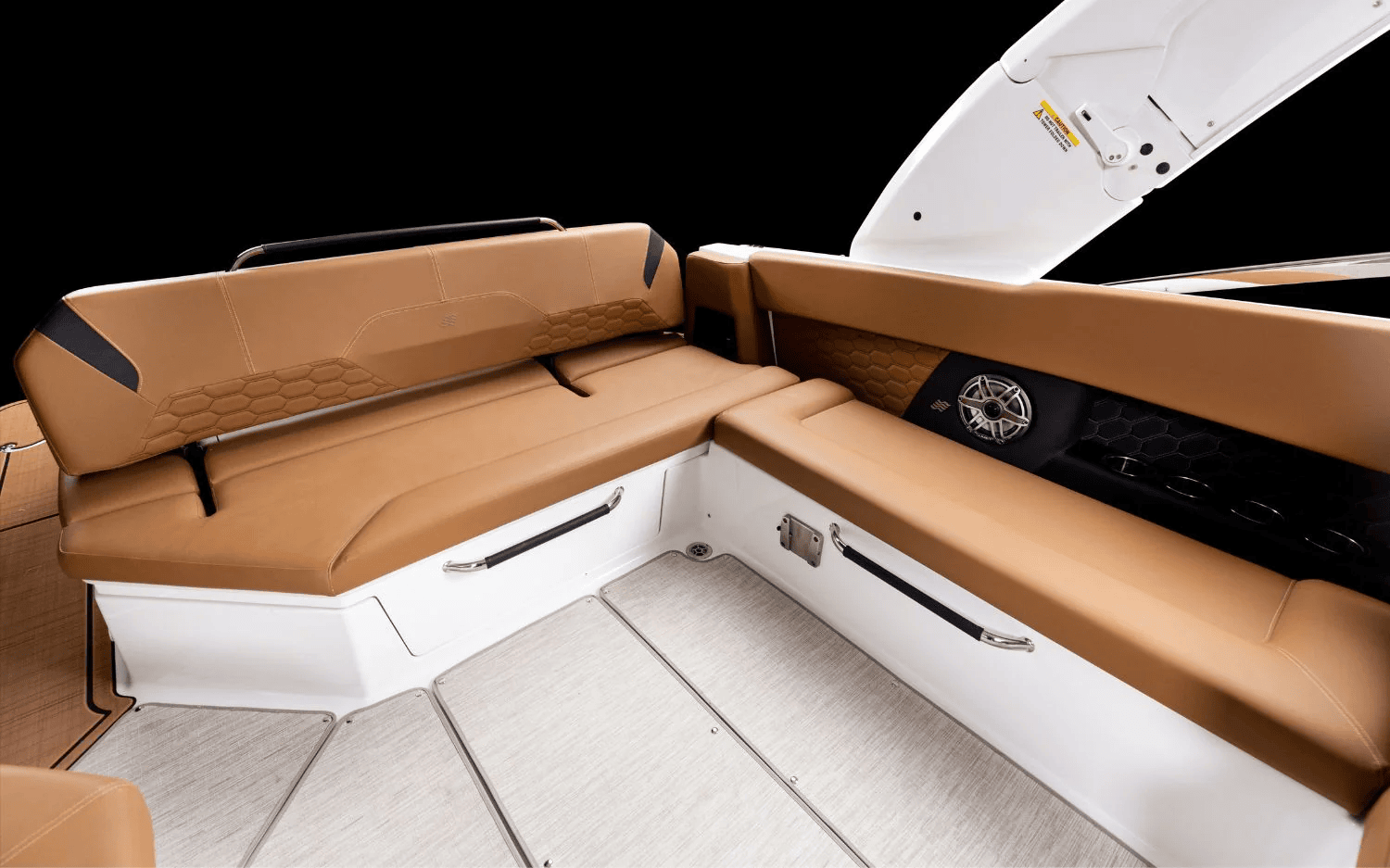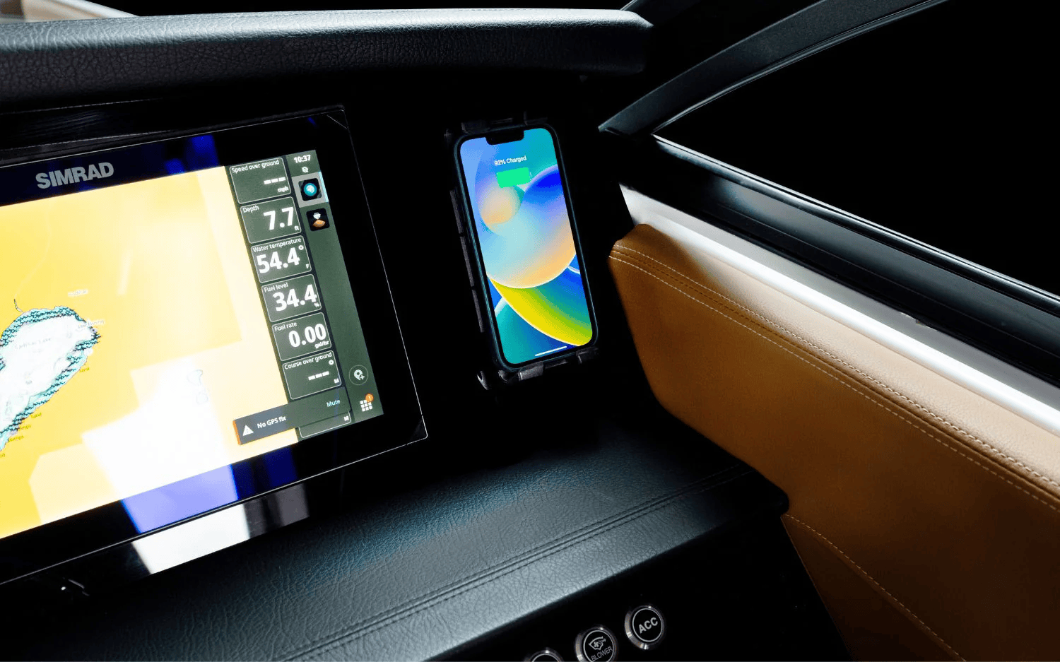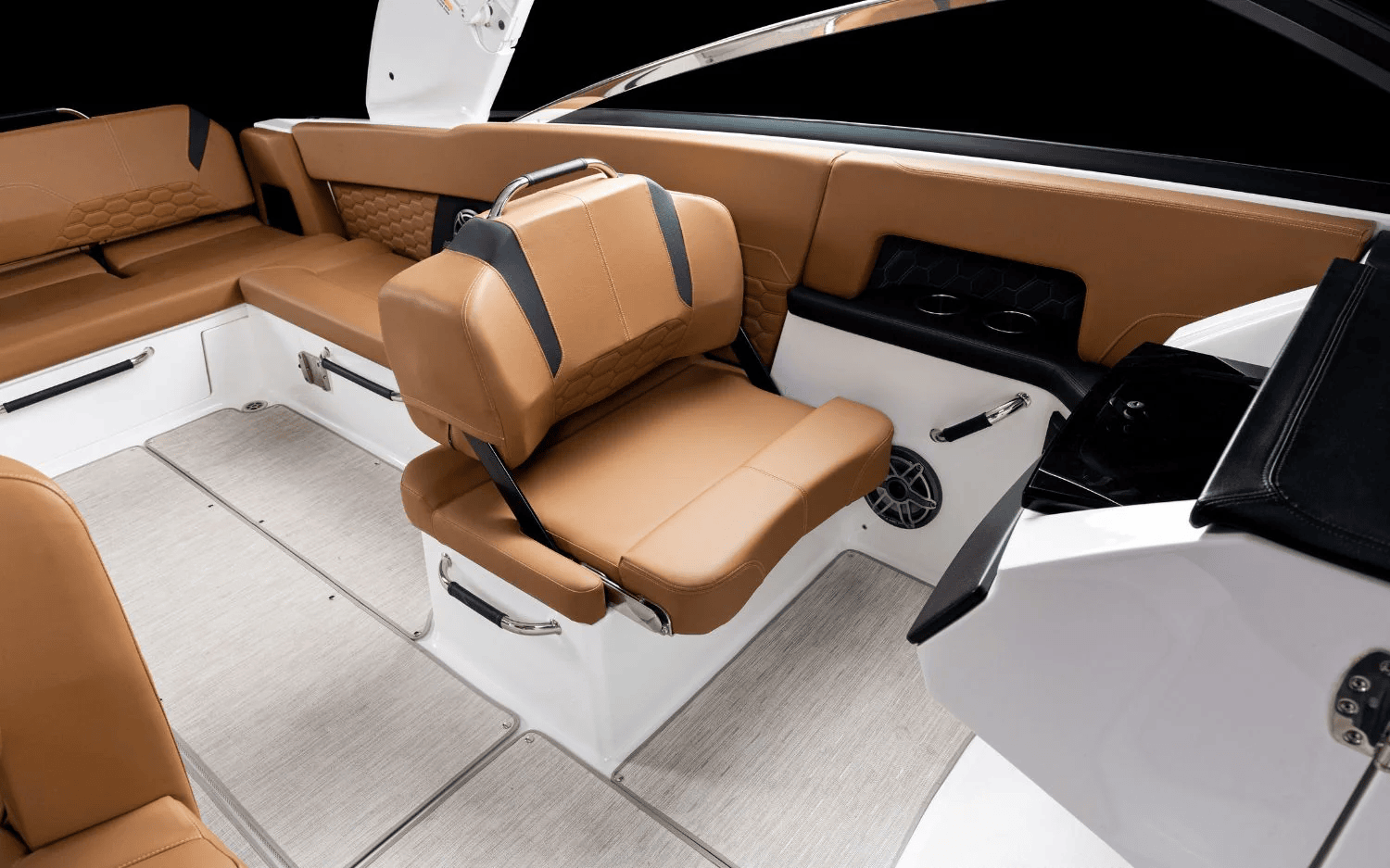 - Приборы штурмана: два 12-дюймовых MFD с сенсорным экраном с данными о двигателе: активное управление и мониторинг, предзагруженные карты, управление аудио, трансдуктор (вода, температура, сонар)