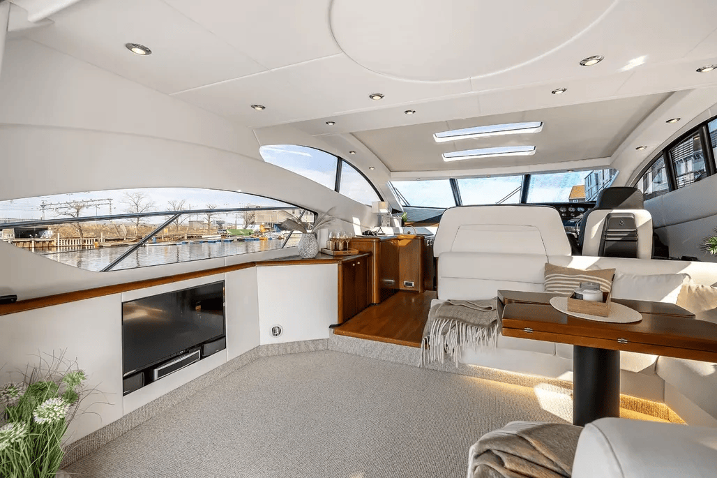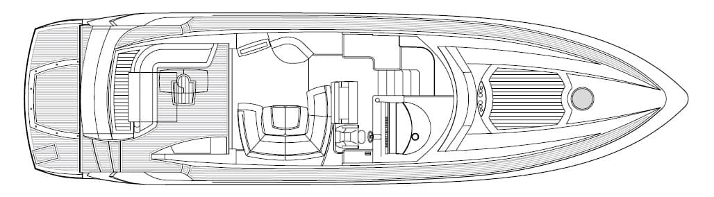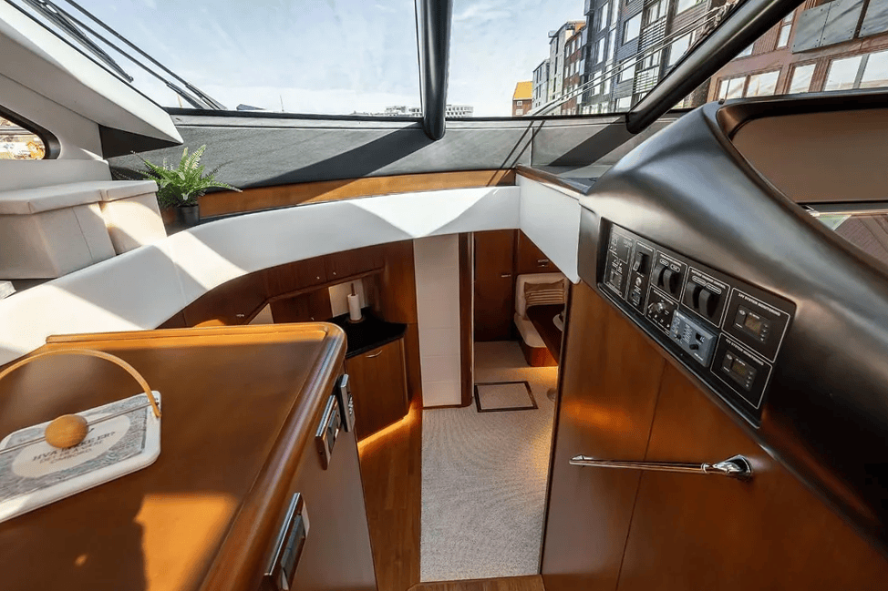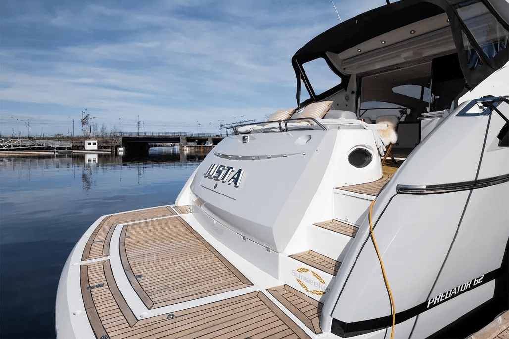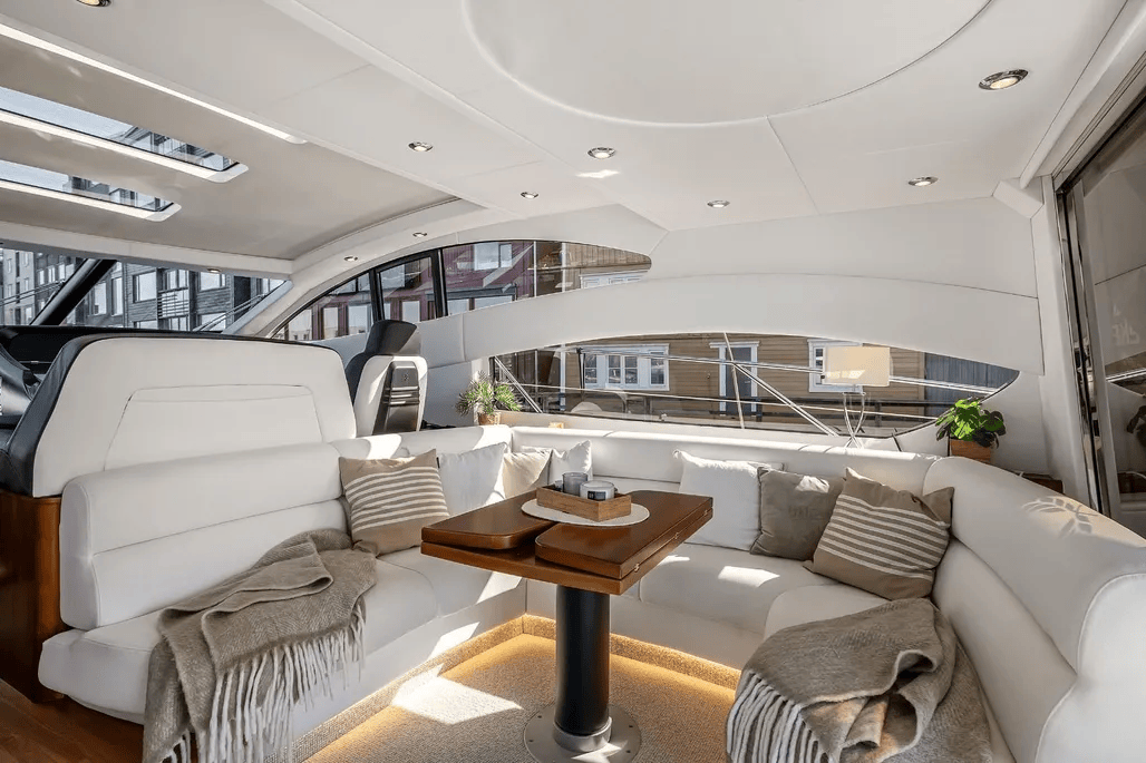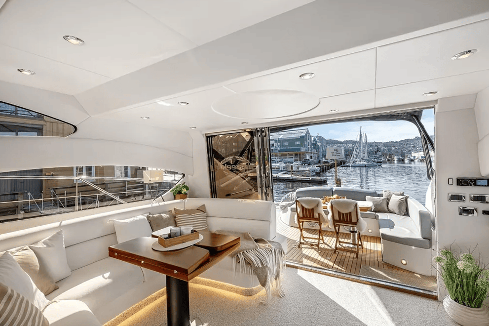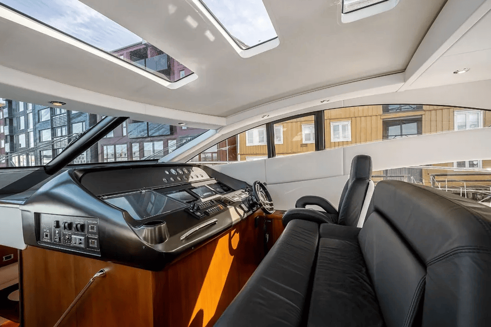 Большая тиковая гидравлическая платформа, кормовой шезлонг, бар с грилем, холодильником и ледогенератором создают идеальную зону отдыха. Раздвижные двери ведут в стильный салон с аудиосистемой Bose, телевизором и тремя новыми экранами Raymarine Axiom для лёгкой навигации. Автопилот, система «Dockmate», носовые и кормовые подруливающие устройства, а также камеры кругового обзора и камеры в машинном отделении обеспечивают лёгкое маневрирование.