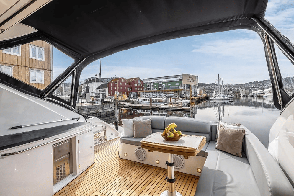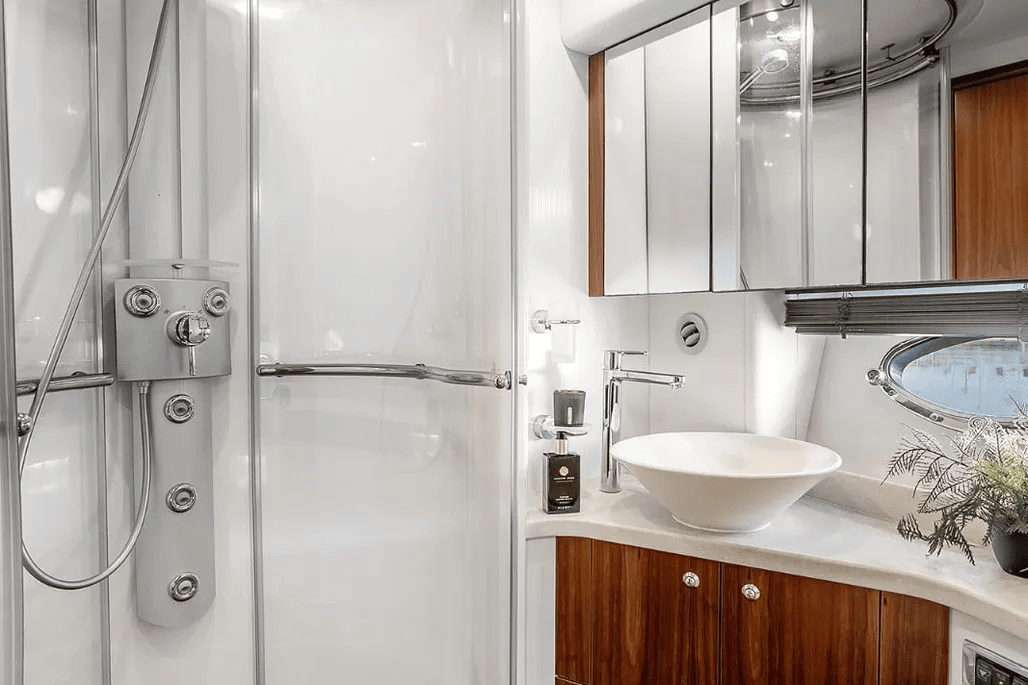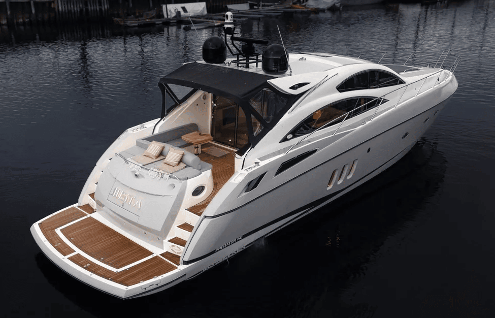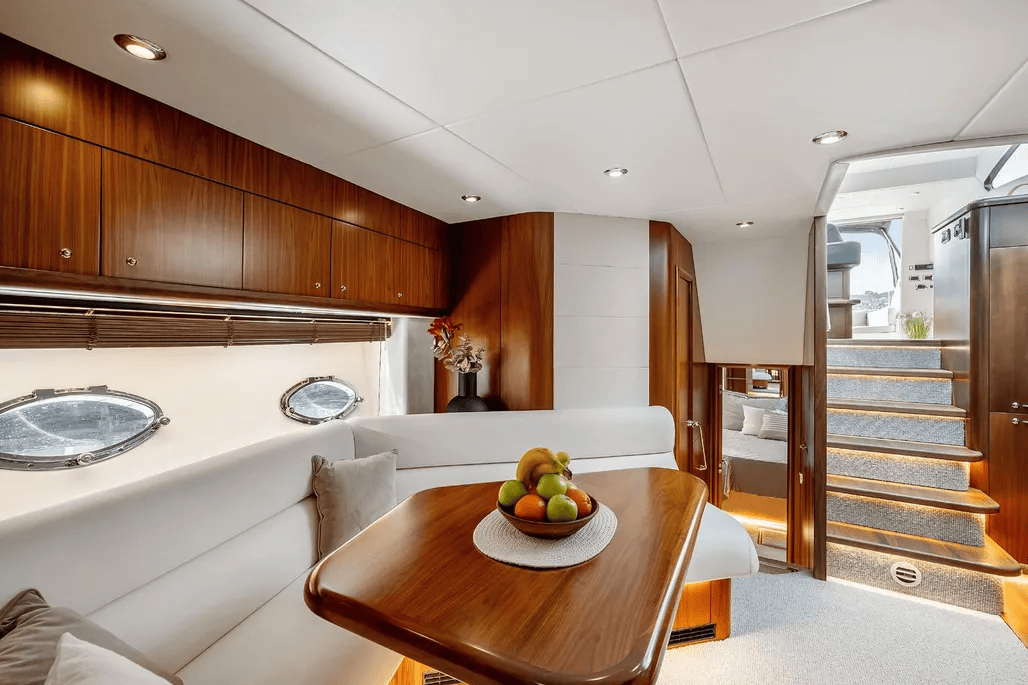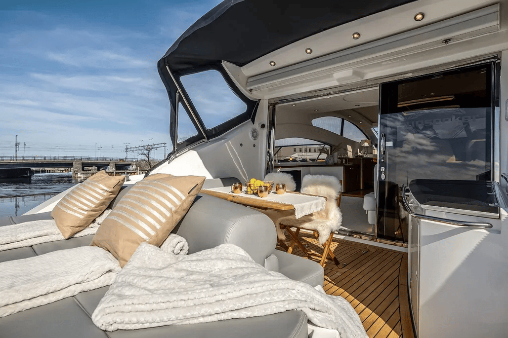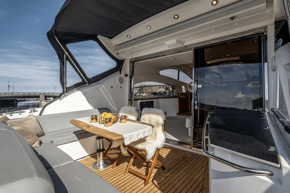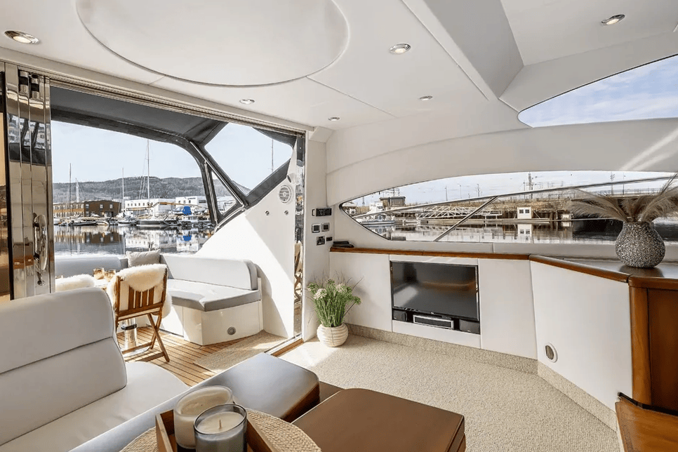 Большая тиковая гидравлическая платформа, кормовой шезлонг, бар с грилем, холодильником и ледогенератором создают идеальную зону отдыха. Раздвижные двери ведут в стильный салон с аудиосистемой Bose, телевизором и тремя новыми экранами Raymarine Axiom для лёгкой навигации. Автопилот, система «Dockmate», носовые и кормовые подруливающие устройства, а также камеры кругового обзора и камеры в машинном отделении обеспечивают лёгкое маневрирование.