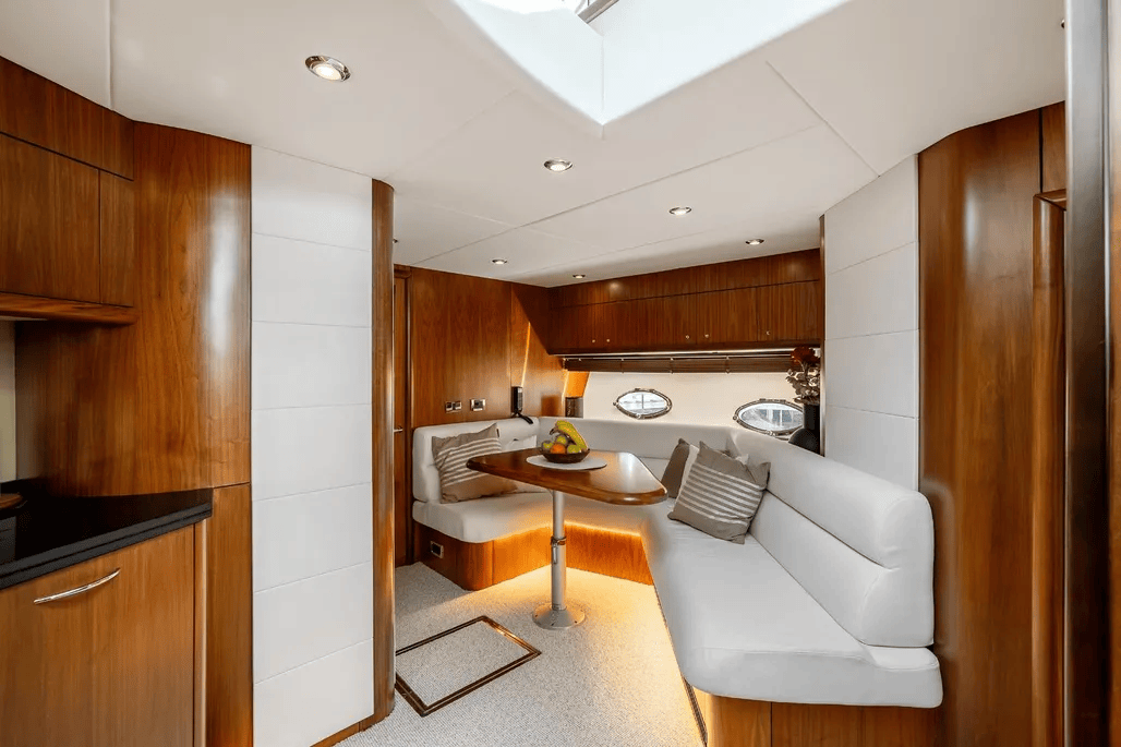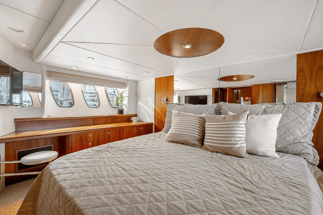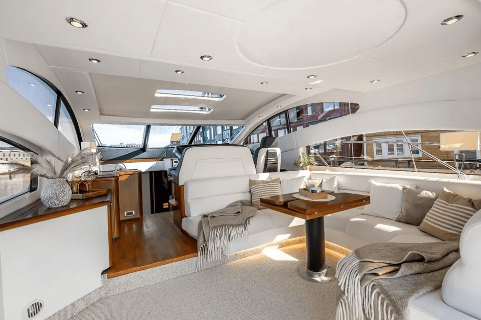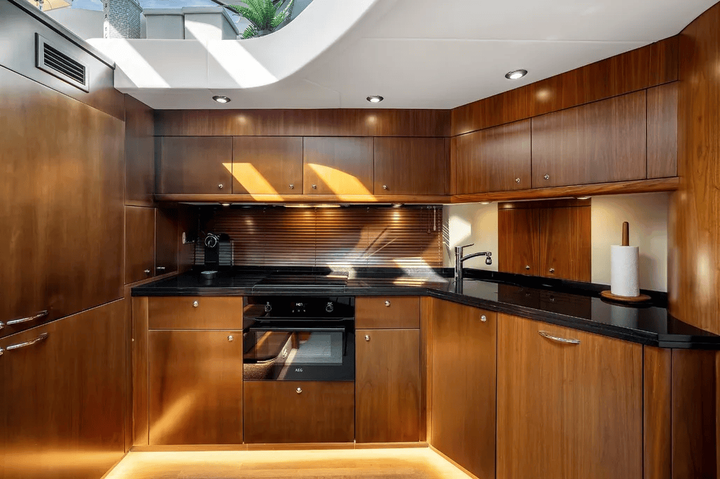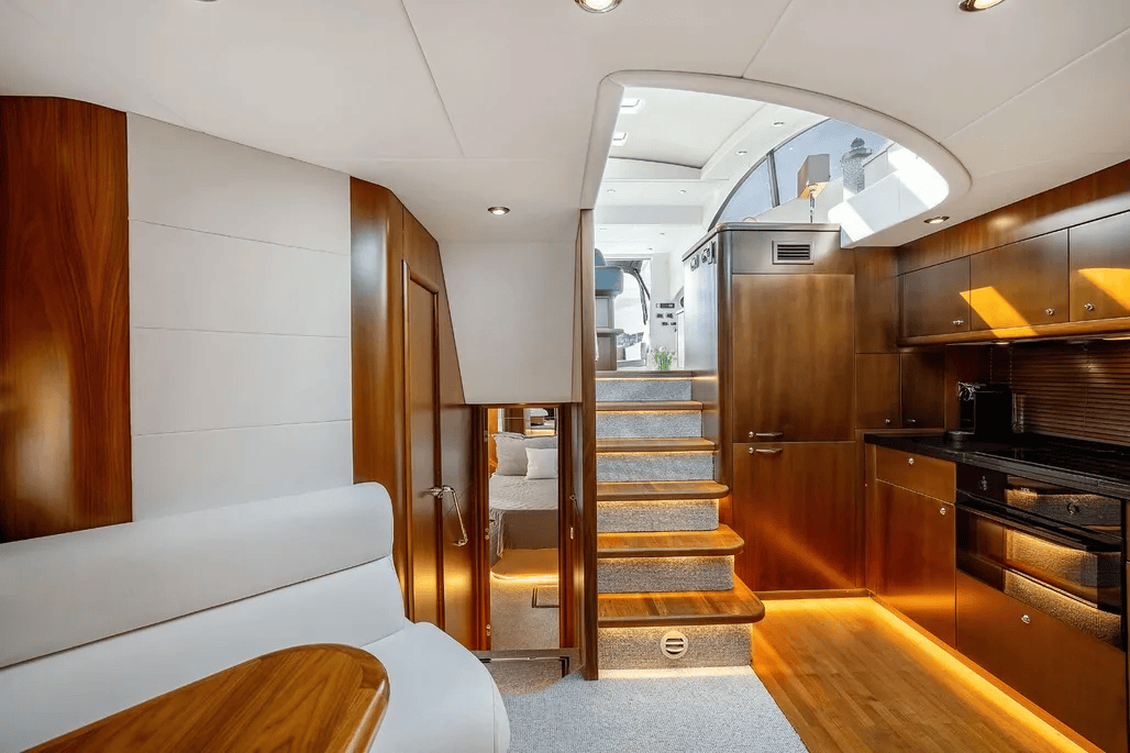 Внутри находятся уютный салон и полноценный камбуз, а нижняя палуба разместила мастер-каюту с панорамными окнами и собственной ванной комнатой, две гостевых каюты и каюта экипажа с туалетом.