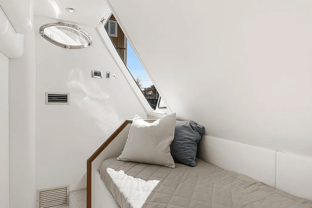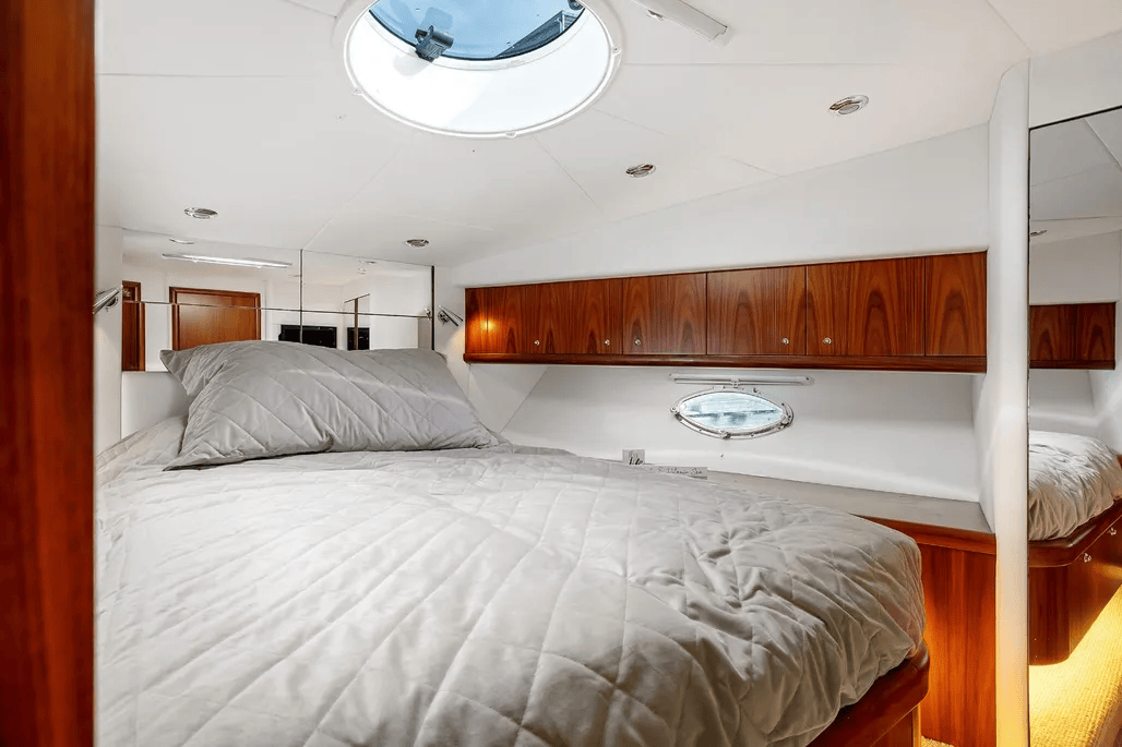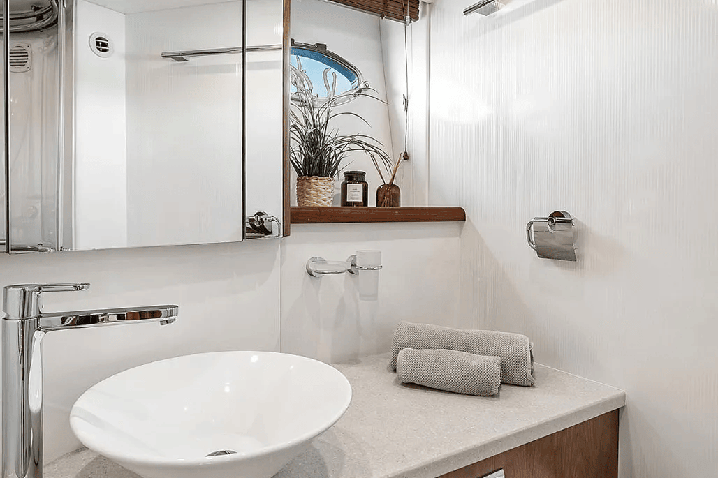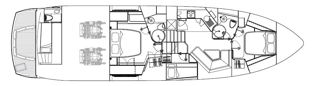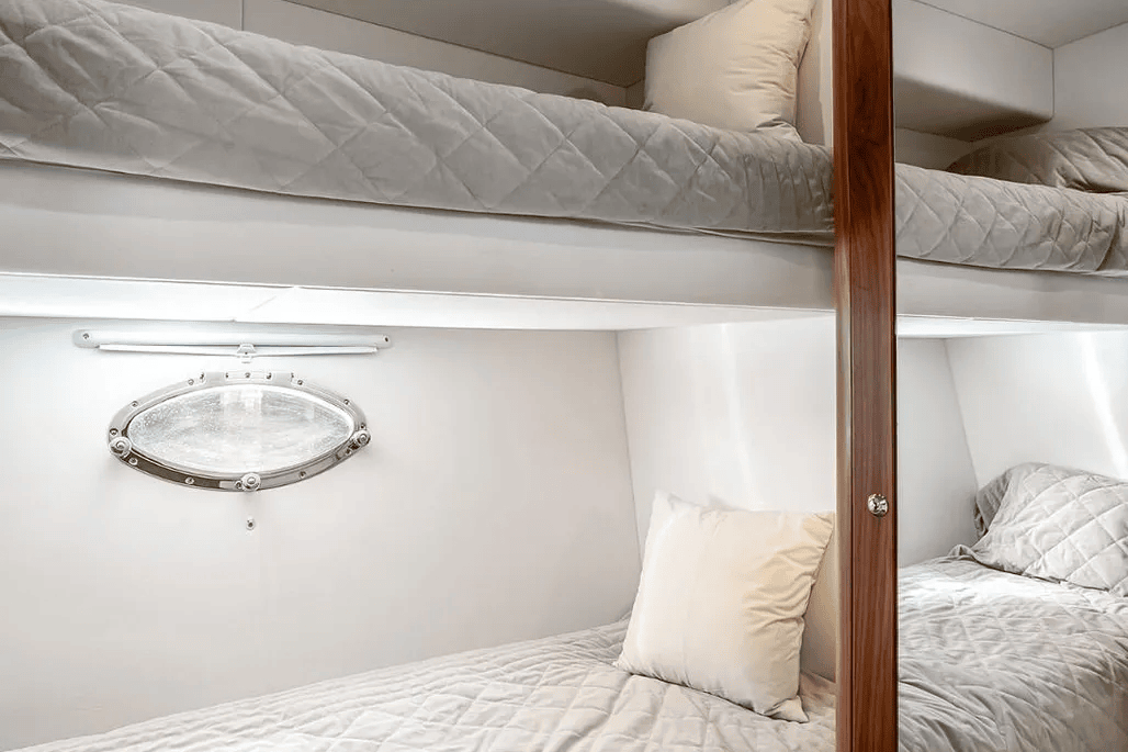 Внутри находятся уютный салон и полноценный камбуз, а нижняя палуба разместила мастер-каюту с панорамными окнами и собственной ванной комнатой, две гостевых каюты и каюта экипажа с туалетом.
