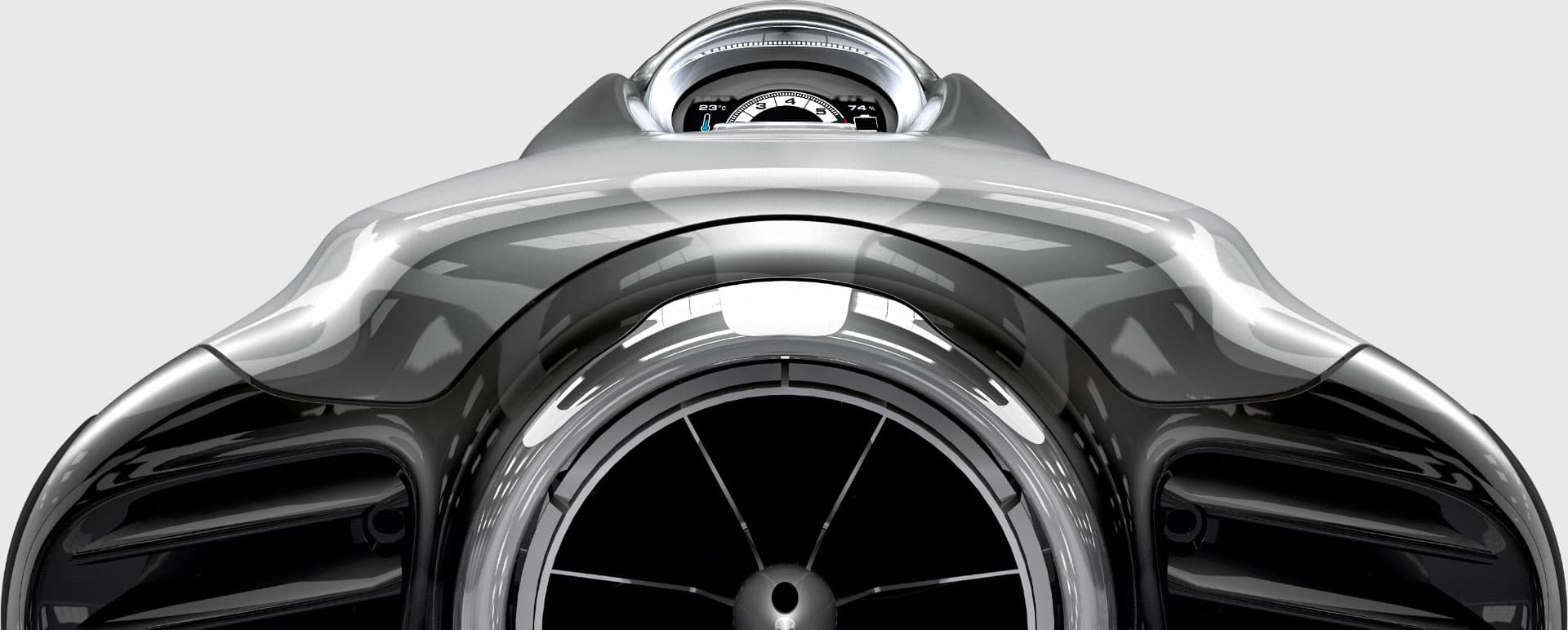 The worldwide patented E-Jet Power System works according to the principle of water displacement. The water is sucked in by the powerfully rotating impeller and forced out in the jet channel under high pressure. The thrust developed in this way propels the SEABOB forward in superior fashion.